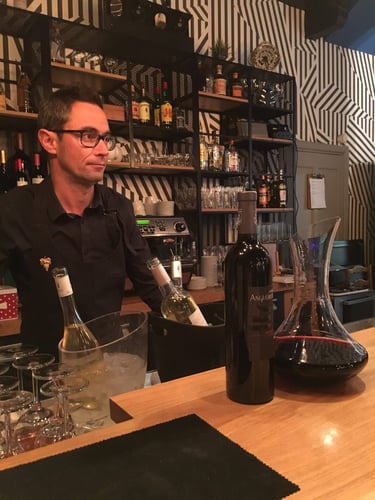 Sur cette photo iconique, le sommelier présente un Château d’Angludet (Bormes-les-Mimosas) carafé pour révéler tout son potentiel. Ce rouge structuré a été le clou du spectacle lors d’une session particulièrement réussie.